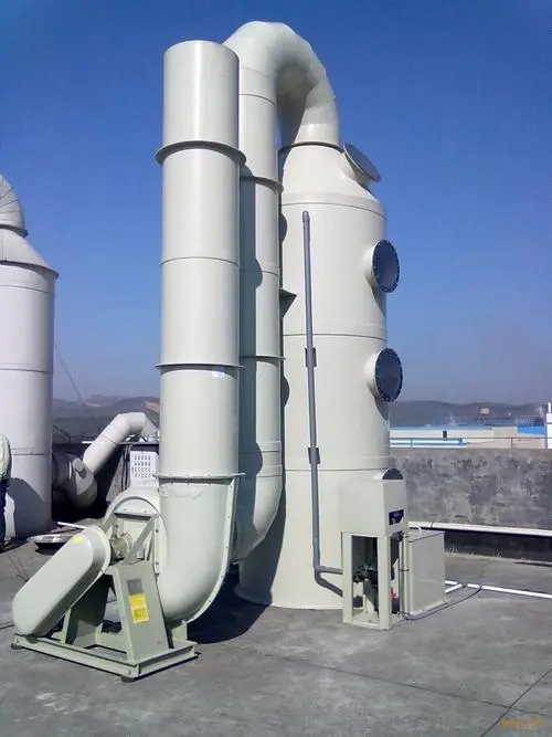 然后進入噴淋層,噴淋形式采用雙層填料和兩級噴淋,使氣液充足接觸,提高了凈化效率。該塔配有玻璃鋼離心風機、塑料水泵或不銹鋼水泵。當處理風量在10000立方米以上時,兩臺泵即可滿足要求。